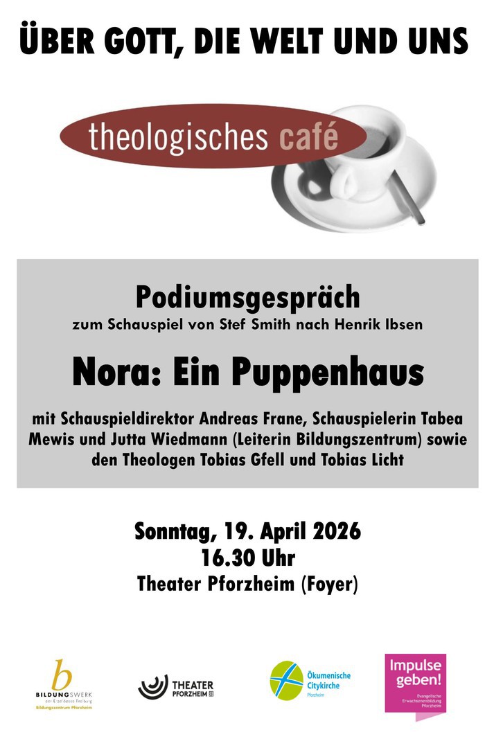 Im Rahmen der Veranstaltungsreihe „Über Gott, die Welt und uns“ lädt das Theologische Theatercafé am Sonntag, 19.4.2026 um 16.30 Uhr ins Foyer des Theaters Pforzheim